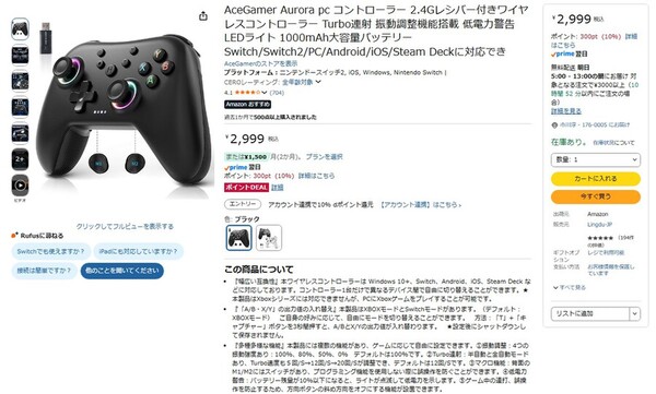 ユーザーレビューを見ると、「コスパの良いコントローラー」「モバイルでもPCでも動作」といった声が寄せられている。Switchやモバイル、PCに対応している点や複数の接続方式がポイントになっているようだ。3000円未満のコントローラーを探している人におすすめできる。