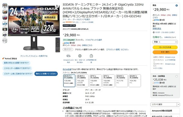 Amazon.co.jpにて、アイ・オー・データ機器の24.5型ゲーミングディスプレー「GigaCrysta EX-GD254U」が販売中だ。価格は2万9980円。