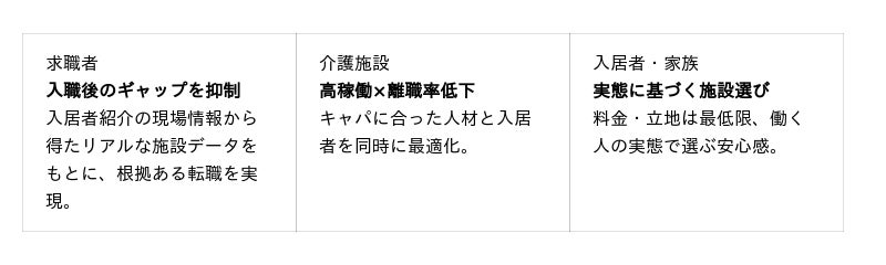 介護・医療従事者と職場をつなぎ、入居者と最適な住まいをつなぎ、ご家族と安心できる選択肢をつなぐことで、介護・医療に関わるすべての人を、ひとつなぎに結んでいきます。」