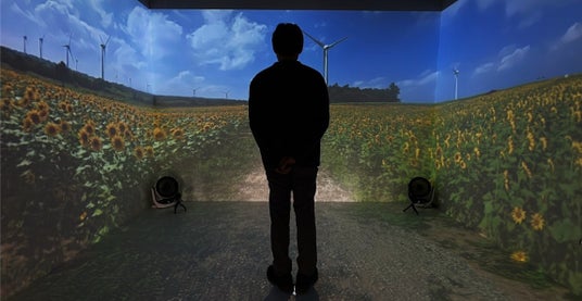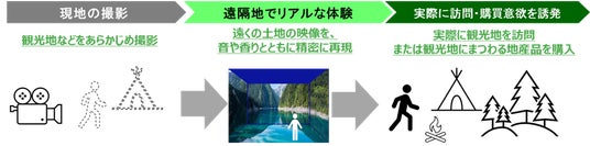 ○没入システムのブース内で福島県の魅力を伝えるべく「郡山布引の風の高原のひまわり畑」、「あづま果樹園」、「霧幻峡の渡し」、「塩屋岬」の気候・風土・環境などを、映像・音響に加え香りも含めて仮想的に体験いただけます。没入システムでの一連の体験が、地域への訪問の動機づけや購買行動に繋がるかを検証します。