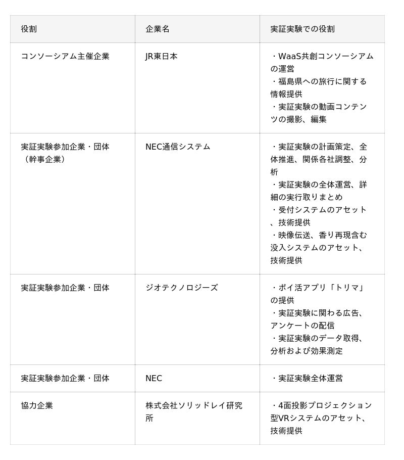○東日本旅客鉄道株式会社(代表取締役社長:喜㔟 陽一、以下「JR東日本」)、日本電気通信システム株式会社(代表取締役 執行役員社長:火物 丈裕、以下「NEC通信システム」)、ジオテクノロジーズ株式会社(代表取締役社長:八剱 洋一郎、以下「ジオテクノロジーズ」)、日本電気株式会社(取締役 代表執行役社長 兼 CEO:森田 隆之、以下「NEC」)は、現地で感じられる感覚を遠隔地で体感できる新しいバーチャル技術(以下、「没入システム」)による遠隔観光体験の実証実験を行います。