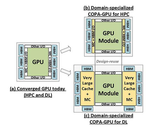 ここからMSMを分離したうえで、HPC向けには最小限のLLCとHBMを接続する形にするのが(b)のHPC向け、大容量LLCと強化したHBM帯域を利用できるようにするのが(c)のDL向けだ。