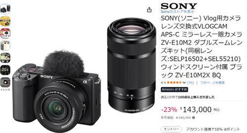 ソニーのVlogカメラ「ZV-E10M2 ダブルズームレンズキット」がAmazonで割引対象。参考価格185,900円のところ、23%オフの143,000円で販売中。