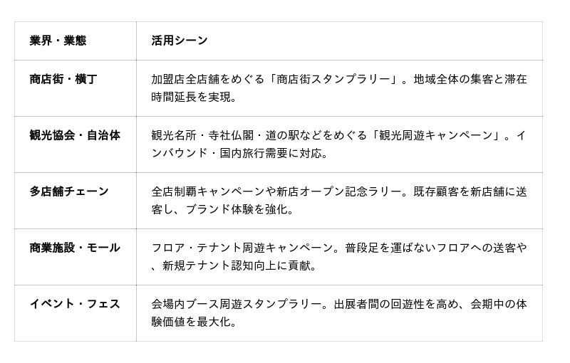 本機能は、商店街・観光地・多店舗チェーン・商業施設・イベント会場など、複数の拠点を「めぐる」体験を促したい事業者向けに設計された、デジタルスタンプラリー機能です。