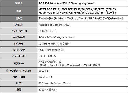ASUS JAPAN株式会社は、ゲーミングブランドのRepublic of Gamers(以下 ROG)より、2月に発表しました「ROG Falchion Ace 75 HE Gaming Keyboard」のキースイッチ別バージョンとして、より精密な入力ができる、ホロウスクエアステムデザインとXスタビライザー採用の独自キースイッチROG HFX V2Xを搭載したモデルを発表しました。2026年4月24日(金)より販売開始します。