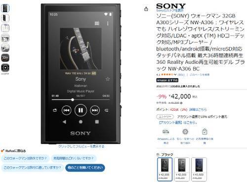 ソニーのウォークマン「NW-A306」がAmazonで割引対象。参考価格46,200円のところ、9%オフの42,000円で販売中。