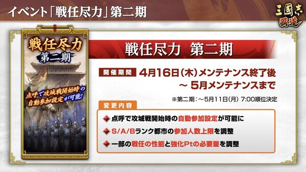 『三國志 覇道』にて長期イベント「戦任尽力」第二期が開催中!4月アップデートを実施