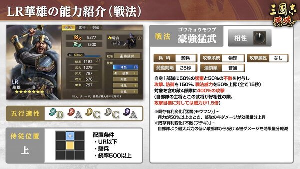 「LR華雄」は、高い物理耐久を持ち、戦法の回転も早められる騎兵武将。最大兵力を参照して条件を満たした際に、敵部隊から受ける物理ダメージで会心/撃心が発生しなくなり、戦法ゲージや戦法速度を上昇させることが可能だ。