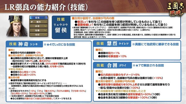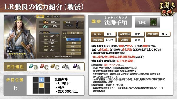 「LR張良」は、新有利変化「献計」によって高いサポート性能を発揮する弓兵武将。自部隊の知力を参照して味方部隊の攻撃、防御、知力を高め、知力の低い敵部隊からの弱化効果を50%の確率で避けることが可能だ。