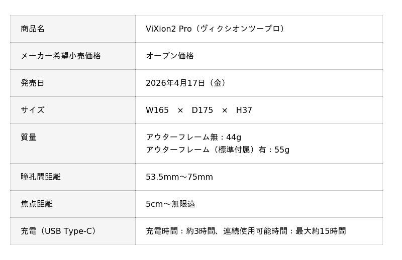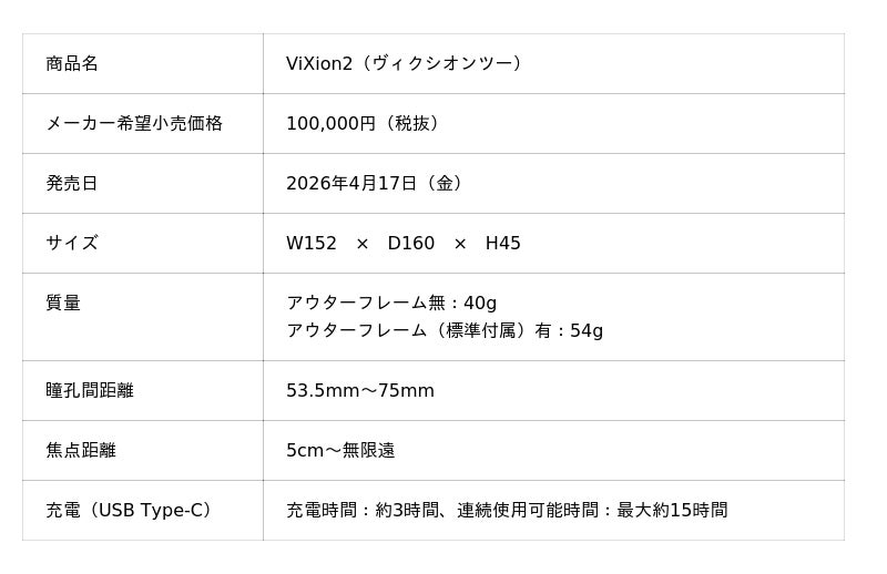 オートフォーカスアイウェア「ViXion」シリーズを開発・販売するViXion株式会社(本社:東京都中央区、代表取締役:南部誠一郎)は、視野面積を従来比で約2.4倍に拡大した新モデル『ViXion2(ヴィクシオンツー)』を2026年4月17日(金)より販売開始します。