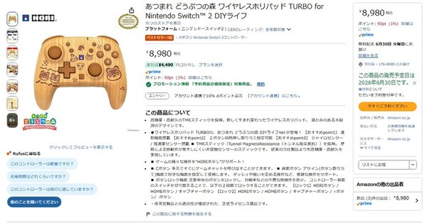 Amazon.co.jpにて、ホリの「あつまれ どうぶつの森 ワイヤレスホリパッド TURBO for Nintendo Switch 2 DIYライフ」が予約受付中だ。発売は6月30日予定で、価格は8980円。