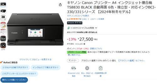 キヤノンのプリンター「TS8830」がAmazonで割引対象。参考価格31,680円のところ、13%オフの27,500円で販売中。