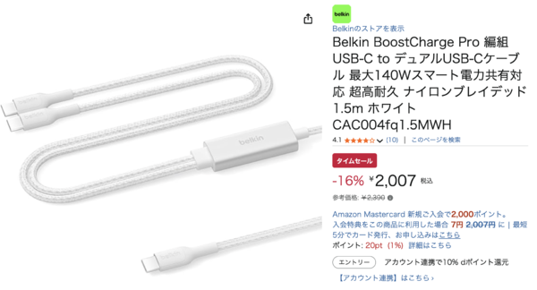 充電したいものは多い、でも充電ケーブルは増やしたくない。そんな“充電ケーブル渋滞”を、1本でスマートに整理してくれそうなのがBelkinの「BoostCharge Pro 編組USB-C to デュアルUSB-Cケーブル ホワイト」。USB-Cを2系統に分けられる充電ケーブルです。Amazonで参考価格2,390円のところ、16%OFFの2,007円で販売中(4月17日現在)。