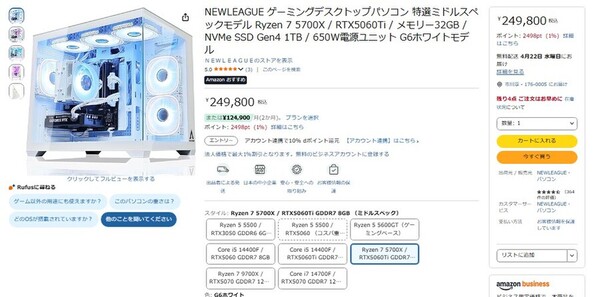 Amazon.co.jpにて、NEWLEAGUEのゲーミングデスクトップPC「G6ホワイトモデル」が販売中だ。価格は24万9800円。