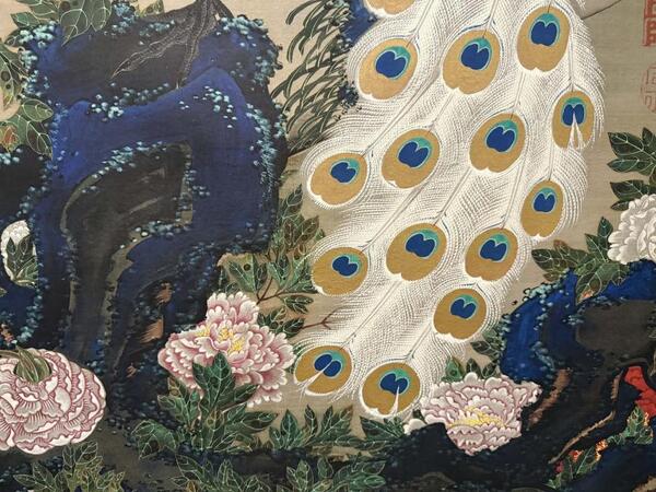 皇室へ献上され、2021年には国宝に指定された本作品は、絹本に描かれ、若冲特有の「裏彩色」などの技法により、250年以上経った今もなお鮮明な輝きを放っている。