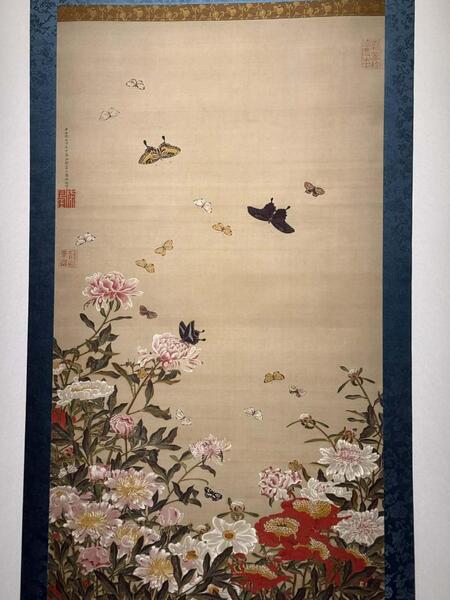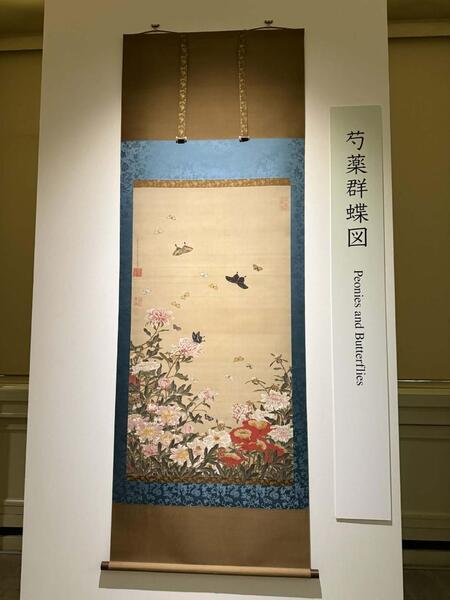芍薬群蝶図(しゃくやくぐんちょうず) シリーズ初期作と推測される。蝶の羽の質感と芍薬の花弁の立体感が露出展示で際立つ。