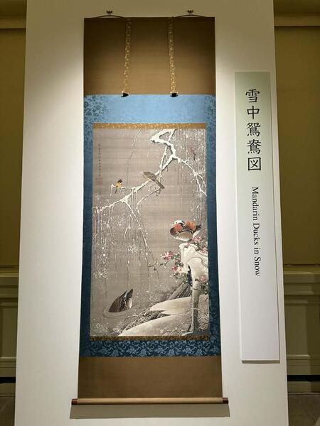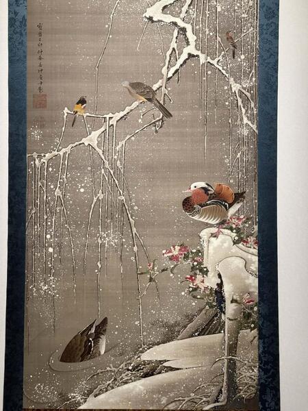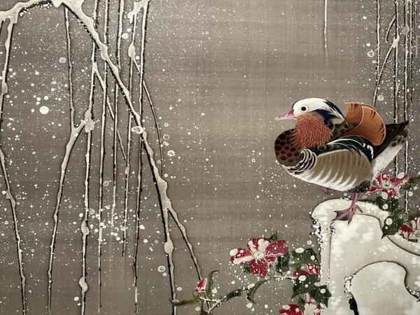 雪中鴛鴦図(せっちゅうえんおうず) 雪の重みを感じさせる柳と、色鮮やかなオシドリの色彩のコントラスト。