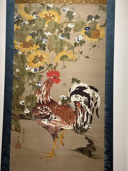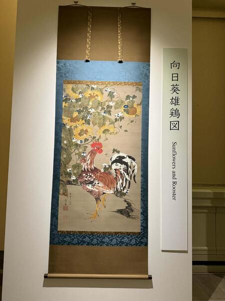 向日葵雄鶏図(ひまわりゆうけいず) 雄鶏の尾羽の「黒」の深さと、向日葵の種の幾何学的な並び。卓越したデザインセンス。