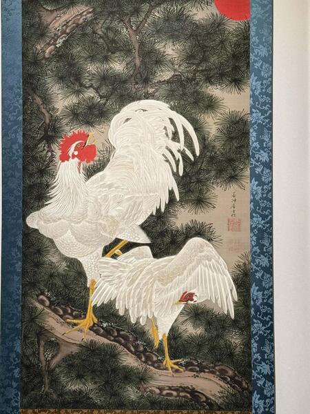 老松白鶏図(ろうしょうはっけいず) 画面中央に大きく配された老いた松の幹を背景に、純白の雄鶏が佇む様子を描いた作品。若冲ならではの緻密な観察眼により、雄鶏の羽毛の質感や、松の樹皮のゴツゴツとした力強さが精緻に表現されている。