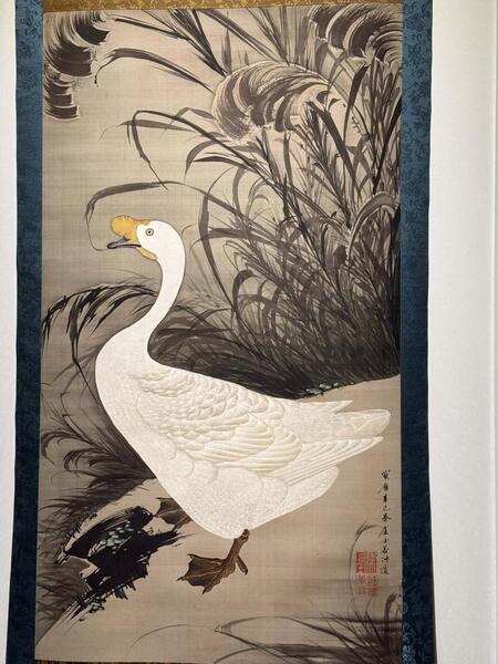 芦雁図(ろがず) 鋭い直線で描かれた「芦の葉」と、なめらかな曲線で描かれた「ガチョウ(鵞)」の対比が特徴的な作品。色彩を抑えたモノトーンに近い世界観の中で、生き物の強い生命力が表現されている。