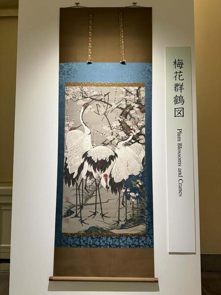 梅花群鶴図(ばいかぐんかくず) 白梅の木を背景に、優雅に集う鶴の群れを描いた作品。若冲の卓越した観察眼と緻密な描写により、鶴の羽の質感や梅の花の細部まで精緻に表現されている。