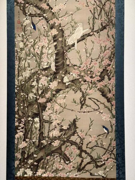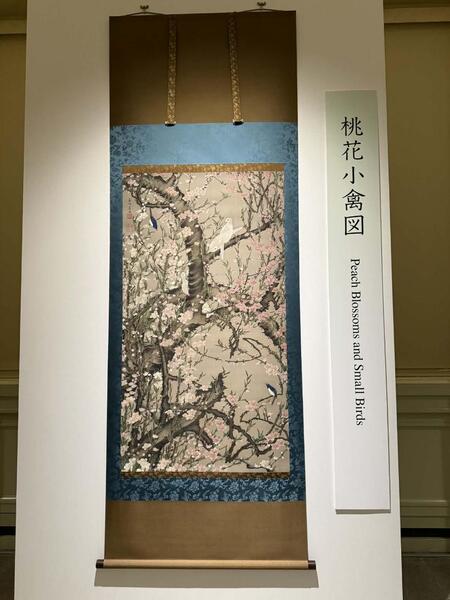 桃花小禽図(とうかしょうきんず) 満開の桃の花の枝に、色鮮やかで愛らしい小鳥たちが集う様子を描いた作品。若冲ならではの緻密な描写により、桃の花弁の繊細さや小鳥たちの生き生きとした表情が表現されている。