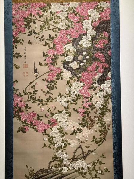 薔薇小禽図(ばらしょうきんず) 緻密に描かれたバラの棘と、可憐な小鳥。若冲の「鋭さ」と「愛らしさ」の同居。
