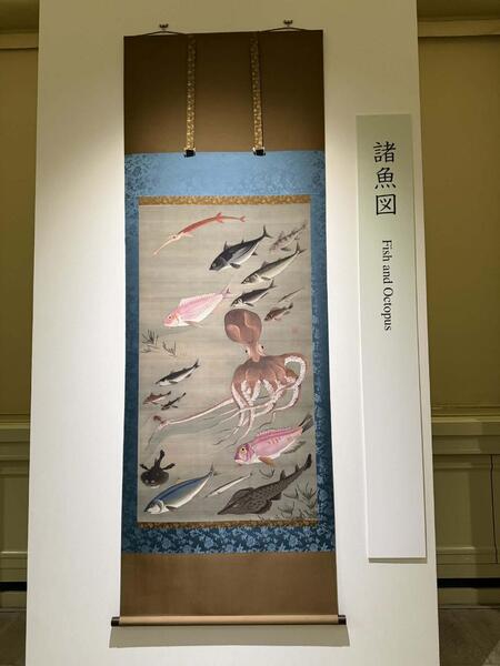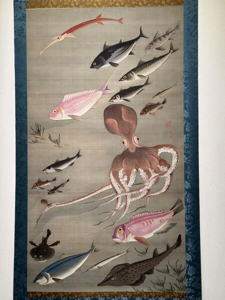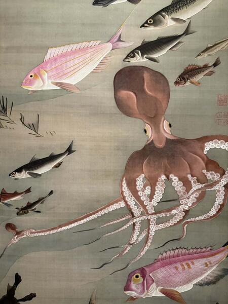 諸魚図(しょぎょず) 画面中央に配された大きな蛸を中心に、多種多様な魚介類がひしめき合うように描かれた作品。若冲の卓越した観察眼により、それぞれの魚の質感や鱗の様子、吸盤のディテールなどが驚異的な緻密さで表現されている。
