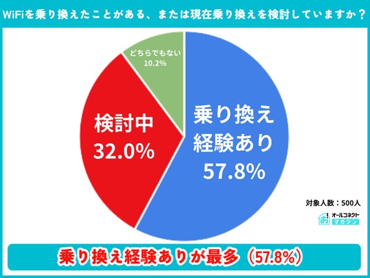 WiFiを乗り換えた経験があるか、または現在乗り換えを検討しているかを聞いたところ、「乗り換え経験あり」57.8%と「検討中」32.0%で、合計89.8%がWiFi乗り換えに関心を持っていることがわかりました。