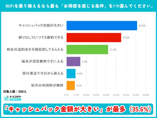 また、WiFiを乗り換えるなら最も「お得感を感じる条件」を聞いたところ、「キャッシュバック金額が大きい」が35.6%で1位でした。