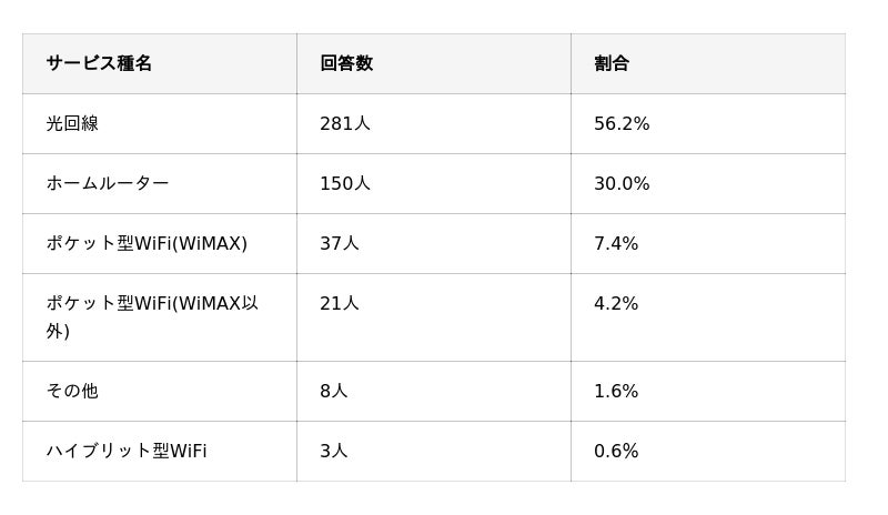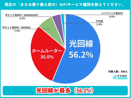 また、現在の(または乗り換え前の)WiFiサービス種別を聞いたところ、「光回線」が56.2%で最多でした。