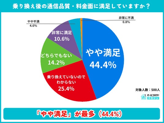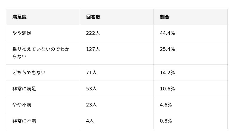 「乗り換えていないのでわからない」(25.4%)を除いた乗り換え経験者に限ると、満足計は約74%に達します。不満(計5.4%)は少数にとどまっています。