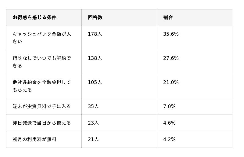 ・「CB」「縛りなし」「違約金負担」で計84.2%がお得感の核
