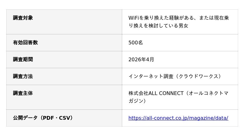 本調査では、WiFi乗り換えの経験率、乗り換え前の回線種別、乗り換え動機、ためらいの理由、乗り換え先の選定条件、乗り換え後の満足度・後悔、次回の乗り換えで確認したい条件、お得感を感じる条件まで、WiFi乗り換えにまつわるユーザーの本音を明らかにしました。