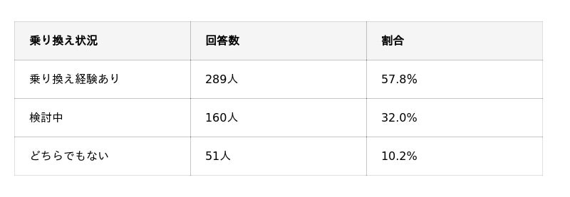 ・乗り換え経験あり57.8%+検討中32.0%=約9割が乗り換えに関心