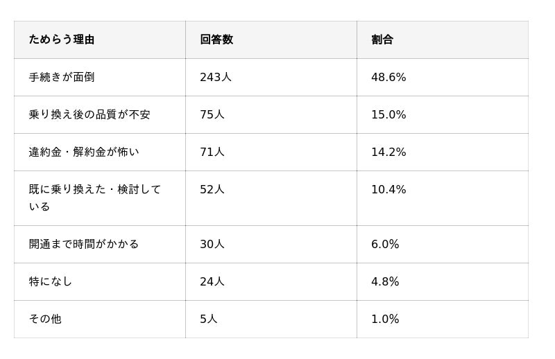 一方、乗り換えをためらう最大の理由は「手続きが面倒」が48.6%で圧倒的1位。「違約金・解約金が怖い」(14.2%)を大きく上回っており、金銭面よりも手間の方がハードルになっている実態が浮き彫りになりました。