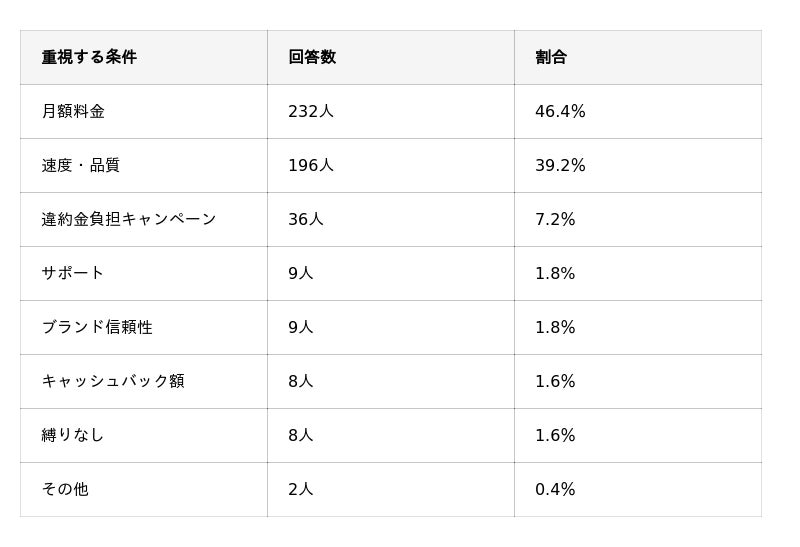 この結果から、速度不満をきっかけに乗り換えを考え始めるものの、実際の選定時には料金も重視し、「速度と料金のバランス」で最終判断していると考えられます。