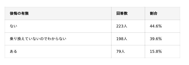 ・後悔「ない」が後悔「ある」の約3倍で、大多数が乗り換えに前向きな結果
