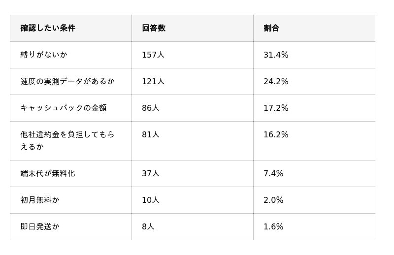 「縛りがないか」が1位であることは、乗り換えをためらう理由で「手続きが面倒」が圧倒的だったことと整合しています。万が一合わなかった場合にすぐ解約・再乗り換えできる自由さを求めていると考えられます。