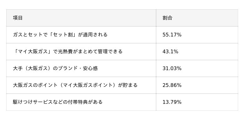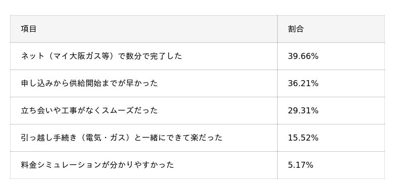 - 管理のしやすさ: 約43%が「マイ大阪ガス」で光熱費を一括管理できる点を評価。大手ブランドの安心感を重視する声も約31%あり、大手ならではの整ったシステムが満足度につながっている。