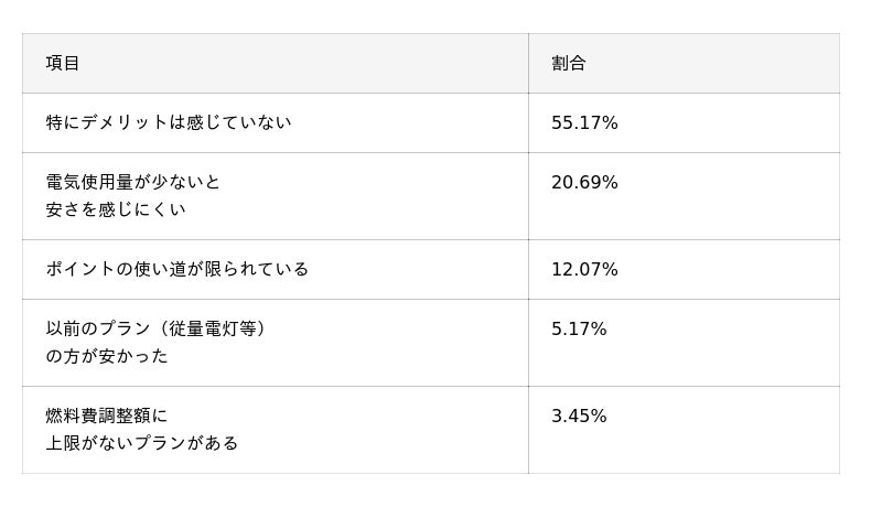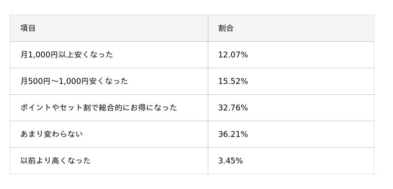 - セット割が好評: 約55%が「ガスとのセット割」を魅力に挙げている。支払額については、約6割が「安くなった」または「ポイント等で総合的にお得になった」と回答し、セット契約によるメリットを実感している。