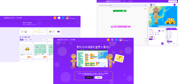 正式版では、地図上にキャラクターやオブジェクトを配置し、「Scratch」ベースのブロックプログラミングで地図を作成可能。作成後は「みんなの地図」として公開・共有でき、他ユーザーの作品を見て学ぶこともできるという。
