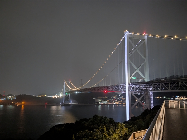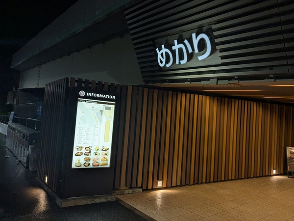 なんとか渋滞を抜け、九州最後の休憩施設である、関門自動車道のめかりパーキングエリアに到着。夜の関門橋を見ながらフグを食べようと思っていたら、「北九州のご当地料理、門司の焼きカレーや小倉の焼うどんをはじめ、九州の素材を使った料理を取り揃えております」というように、九州の人はあまりフグを食べない様子。そこで北九州名物と謳う「彩り野菜の焼きビーフカレー(1360円)」を注文して夕飯終了。