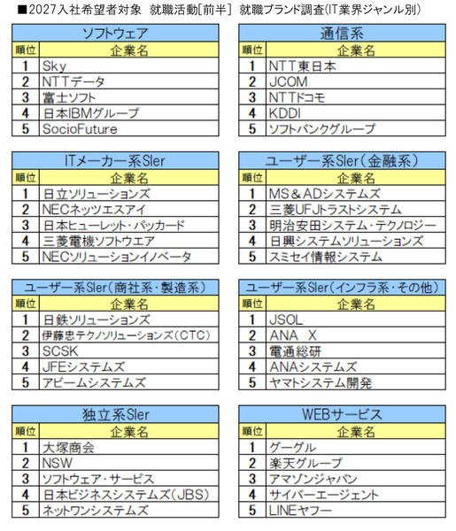 2027年卒業予定の学生(現大学4年生/大学院2年生)を対象とした「就職ブランド調査[前半]」から、IT業界の企業を抜き出し、8つのジャンルに分類してランキングを発表した。なおこれに先駆けて3月に発表した全業界の総合ランキングでは、「Sky」が13位、「日立ソリューションズ」が20位にランクインしている。