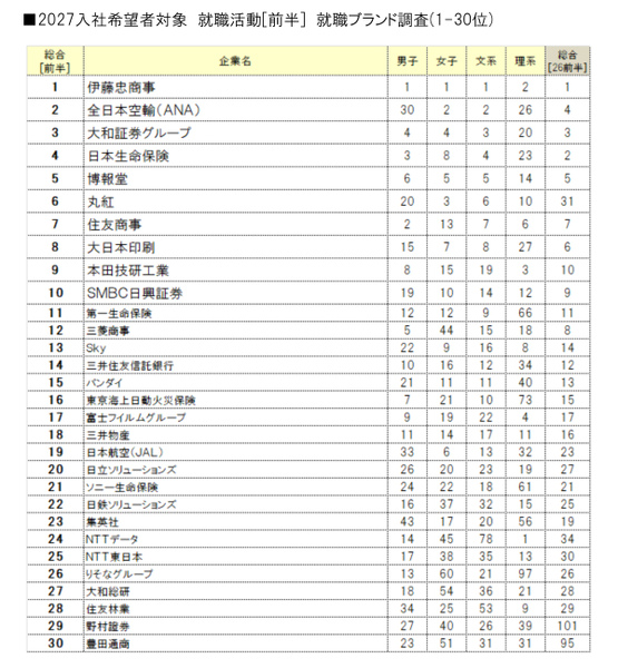 [就活] 2027年卒の就活学生に人気のIT企業は? ソフトウェア/通信/SIer/Webサービスなど業界別ランキング(文化放送キャリアパートナーズ、4月13日)