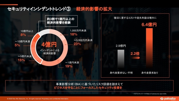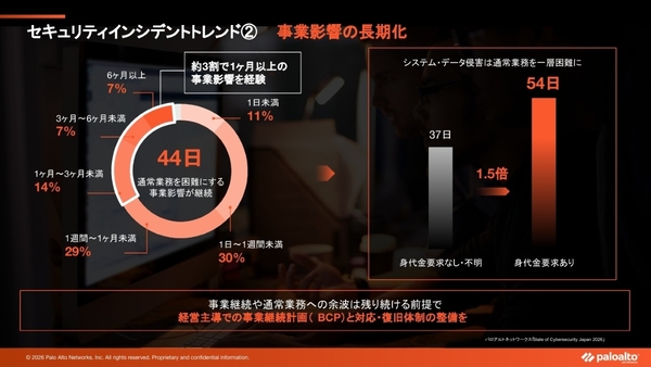 パロアルトネットワークスが2026年4月17日に発表した調査によると、2025年に身代金要求型の被害を経験した国内組織は、他脅威の被害組織と比べ、事業への平均影響期間が約1.5倍長期化し、平均経済損失も約2.2倍に増大していることが判明した。加えて、被害組織の6割超が「身代金の支払いを否定しきれない」と回答しており、システム・データ復旧の困難さが伺える。