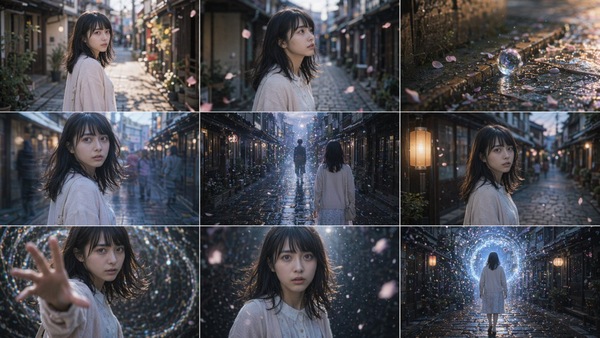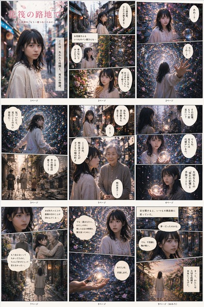 さらに、作った設定やストーリーボードを使って漫画に展開することもできます。プロンプトは「この設定を利用して、不思議な体験をするマンガを、複数ページで作成して。縦サイズで、右から左読み、日本語で」です。