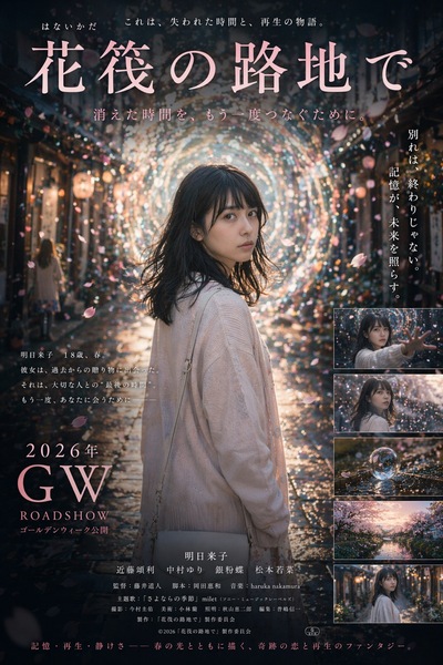 「画像1、画像2、画像3、画像4をもとに映画のポスターを縦長で作成してください。2026年のGWに公開される日本映画です。別れをテーマにした切ない物語で、世界観を示すキービジュアル、キャッチコピー、説明などを追加して、多くの人の耳目を集められるような構成を検討してください。 」