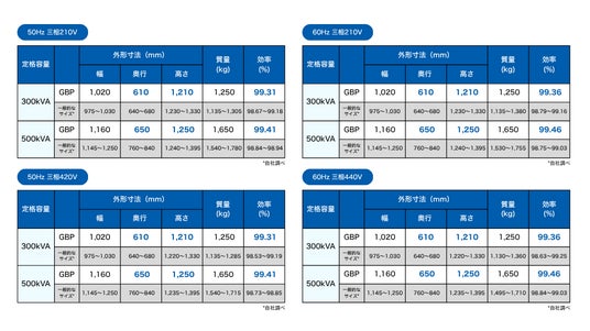 定格容量500kVAでは奥行650mmを実現し、一般的なサイズと比べて最小値比で110mmの小型化を実現しています(約15%の削減に相当)。いずれの製品も、一般的な幅の範囲内に収めながら、高さを抑え、奥行の小型化を図りました。