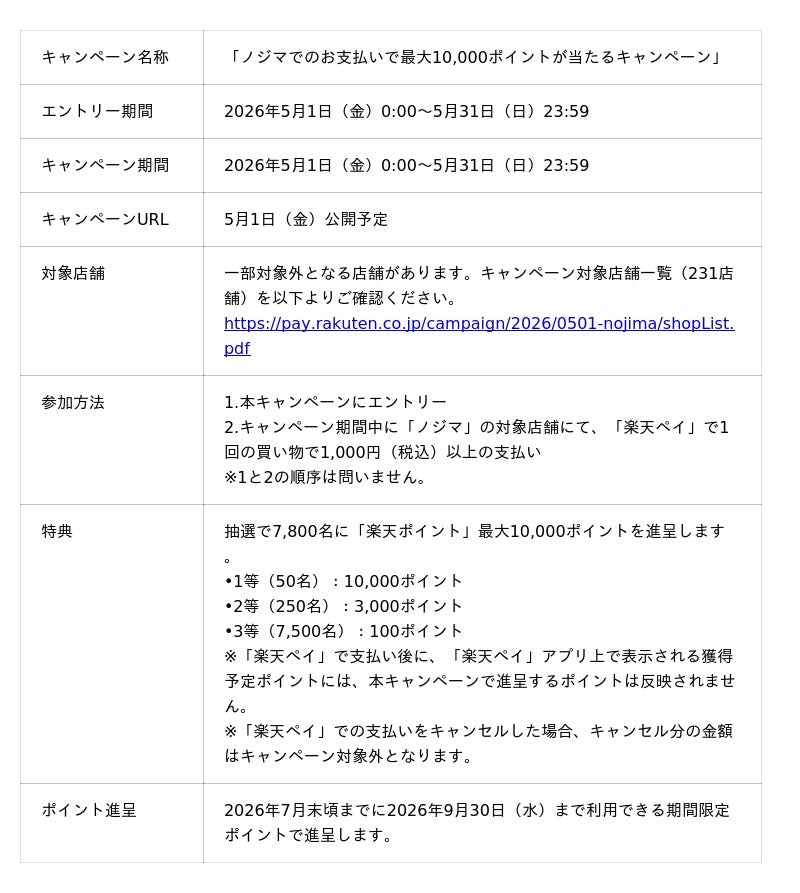 本導入を記念して、2026年5月1日(金)から5月31日(日)まで、「ノジマでのお支払いで最大10,000ポイントが当たるキャンペーン」を実施します。